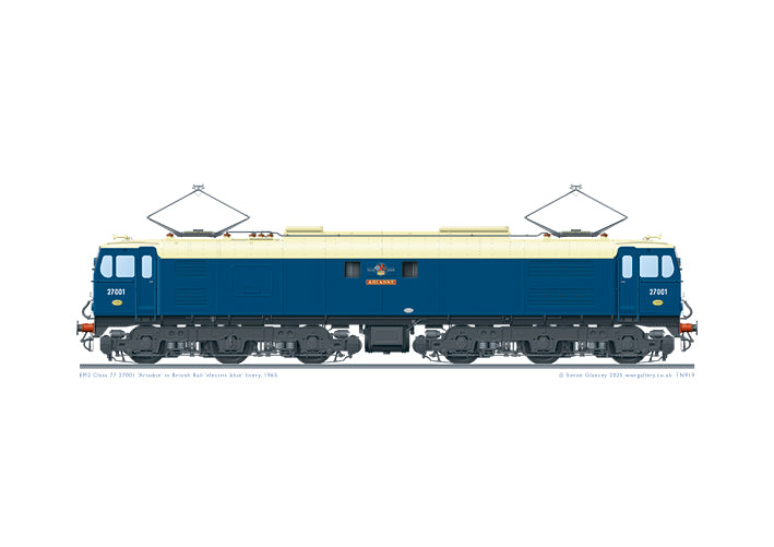 A superbly-detailed A3 art print of British Rail EM2 Class 77 electric locomotive 27001 'Ariadne' in B.R. 'electric blue' livery, 1965. The name has recently been re-introduced on Direct Rail Services Class 88 loco 88008.