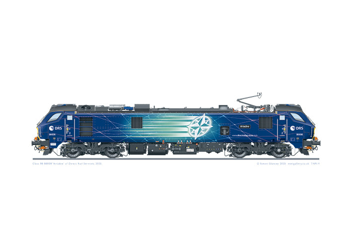 A super-detailed A3 print of DRS Class 88 bi-mode locomotive 88008, named Ariadne after the duaghter of King Minos in Greek mythology. The name Ariadne was previously applied to B.R. EM2 Class 77 Woodhead electric loco 27001.
