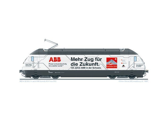 A highly-detailed A3 print of Swiss Railways Re 460 class locomotive 460 052-4, in the ‘Werbelok’ livery of ABB with ‘Gottardo 2016’ branding. This loco was originally named ‘Eigenamt’ and was delivered to SBB in July 1993.