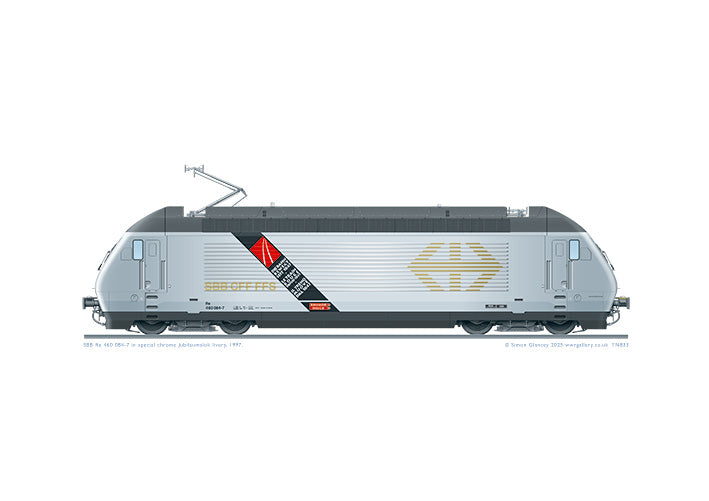 A super-detailed A3 print of SBB electric locomotive Re 460 084-7 in the stunning all over chrome livery it received in March 1997 to mark the 150th Anniversary of the opening of the first railway in Switzerland between Zürich and Baden.