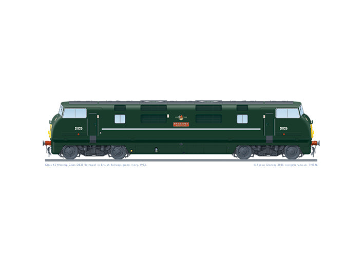 Superbly-detailed A3 size print of BR Class 42 'Warship' locomotive D825 'Intrepid' in British Railway green livery with small yellow warning panels as it appeared in 1962.