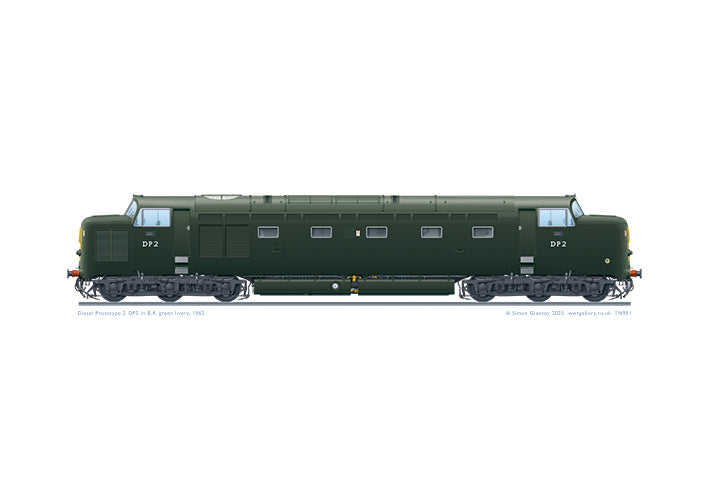 {"id":15612497789306,"title":"English Electric Diesel Prototype 2 DP2 1962","handle":"english-electric-diesel-prototype-2-dp2-1962","description":"\u003cp\u003eA super-detailed A3 print of English Electric DP2, effectively a protoype for what would become the Class 50 locomotives. Built alongside the Deltics at the Vulcan Foundry, it shared their basic outward appearance but DP2 was significantly different beast under the skin. After successfully operating with British Rail it was written off in a serious accident at Thirsk on July 31st 1967. Depicted in the original all over BR green livery it wore when new in 1962.\u003c\/p\u003e","published_at":"2026-01-09T17:36:57+00:00","created_at":"2026-01-09T17:36:56+00:00","vendor":"WWR Gallery","type":"DP2","tags":["A3 art print","A3 print","A3 profile","A3 profile print","A3 train print","locomotive artwork","Locomotive illustration","Locomotive print","Locomotive profile","Train art","train illustration","train print","train profile","Type_DP2"],"price":1499,"price_min":1499,"price_max":1499,"available":true,"price_varies":false,"compare_at_price":null,"compare_at_price_min":0,"compare_at_price_max":0,"compare_at_price_varies":false,"variants":[{"id":56448026116474,"title":"Default Title","option1":"Default Title","option2":null,"option3":null,"sku":"TN951","requires_shipping":true,"taxable":true,"featured_image":null,"available":true,"name":"English Electric Diesel Prototype 2 DP2 1962","public_title":null,"options":["Default Title"],"price":1499,"weight":250,"compare_at_price":null,"inventory_management":null,"barcode":"","requires_selling_plan":false,"selling_plan_allocations":[]}],"images":["\/\/www.wwrgallery.co.uk\/cdn\/shop\/files\/TN951-DP2-1962.jpg?v=1767980081"],"featured_image":"\/\/www.wwrgallery.co.uk\/cdn\/shop\/files\/TN951-DP2-1962.jpg?v=1767980081","options":["Title"],"media":[{"alt":"English Electric Diesel Prototype 2 DP2 1962","id":69416972255610,"position":1,"preview_image":{"aspect_ratio":1.415,"height":501,"width":709,"src":"\/\/www.wwrgallery.co.uk\/cdn\/shop\/files\/TN951-DP2-1962.jpg?v=1767980081"},"aspect_ratio":1.415,"height":501,"media_type":"image","src":"\/\/www.wwrgallery.co.uk\/cdn\/shop\/files\/TN951-DP2-1962.jpg?v=1767980081","width":709}],"requires_selling_plan":false,"selling_plan_groups":[],"content":"\u003cp\u003eA super-detailed A3 print of English Electric DP2, effectively a protoype for what would become the Class 50 locomotives. Built alongside the Deltics at the Vulcan Foundry, it shared their basic outward appearance but DP2 was significantly different beast under the skin. After successfully operating with British Rail it was written off in a serious accident at Thirsk on July 31st 1967. Depicted in the original all over BR green livery it wore when new in 1962.\u003c\/p\u003e"}