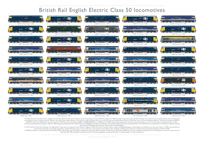 {"id":15612445655418,"title":"The Class 50s print","handle":"the-class-50s-print","description":"\u003cp\u003eA highly-detailed A3 (420mm x 297mm) print depicting all fifty of the English Electric Class 50 locomotives from 50001 to 50050 in a wide variety of the liveries the class has worn since their introduction in the late 1960's. Included are several of the one-off liveries they received in service, as well as some applied post-preservation.\u003c\/p\u003e","published_at":"2026-01-09T17:19:49+00:00","created_at":"2026-01-09T17:19:48+00:00","vendor":"WWR Gallery","type":"Class 50","tags":["A3 art print","A3 print","A3 profile","A3 profile print","A3 train print","Class 50 artwork","Class 50 illustration","Class 50 print","Class 50 profile","locomotive artwork","Locomotive illustration","Locomotive print","Locomotive profile","Train art","train illustration","train print","train profile","Type_Class 50"],"price":1699,"price_min":1699,"price_max":1699,"available":true,"price_varies":false,"compare_at_price":null,"compare_at_price_min":0,"compare_at_price_max":0,"compare_at_price_varies":false,"variants":[{"id":56447862440314,"title":"Default Title","option1":"Default Title","option2":null,"option3":null,"sku":"TN950","requires_shipping":true,"taxable":true,"featured_image":null,"available":true,"name":"The Class 50s print","public_title":null,"options":["Default Title"],"price":1699,"weight":250,"compare_at_price":null,"inventory_management":null,"barcode":"","requires_selling_plan":false,"selling_plan_allocations":[]}],"images":["\/\/www.wwrgallery.co.uk\/cdn\/shop\/files\/TN950-Class-50s.jpg?v=1767978974"],"featured_image":"\/\/www.wwrgallery.co.uk\/cdn\/shop\/files\/TN950-Class-50s.jpg?v=1767978974","options":["Title"],"media":[{"alt":"The fifty Class 50 locomotives","id":69416705851770,"position":1,"preview_image":{"aspect_ratio":1.415,"height":501,"width":709,"src":"\/\/www.wwrgallery.co.uk\/cdn\/shop\/files\/TN950-Class-50s.jpg?v=1767978974"},"aspect_ratio":1.415,"height":501,"media_type":"image","src":"\/\/www.wwrgallery.co.uk\/cdn\/shop\/files\/TN950-Class-50s.jpg?v=1767978974","width":709}],"requires_selling_plan":false,"selling_plan_groups":[],"content":"\u003cp\u003eA highly-detailed A3 (420mm x 297mm) print depicting all fifty of the English Electric Class 50 locomotives from 50001 to 50050 in a wide variety of the liveries the class has worn since their introduction in the late 1960's. Included are several of the one-off liveries they received in service, as well as some applied post-preservation.\u003c\/p\u003e"}