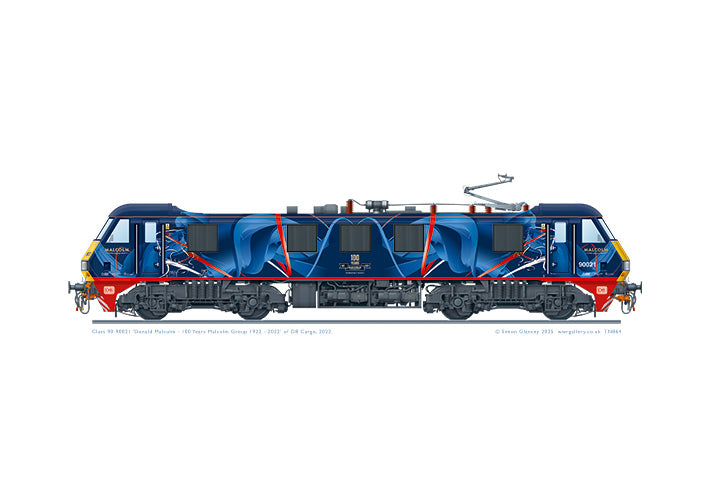 A superbly-detailed A3 art print of DB Cargo Class 90 locomotive 90021 in the stunning livery it received in 2022 to celebrate 100 years of the Malcolm Group. The loco was named 'Donald Malcolm' on April 19th 2022, but unusually this namplate is carried on one side only. The print depicts the other side, and eagle-eyed viewers might note that the vinyls on this side of the actual loco are not exactly 100% symmetrical, and this is replicated on the print.