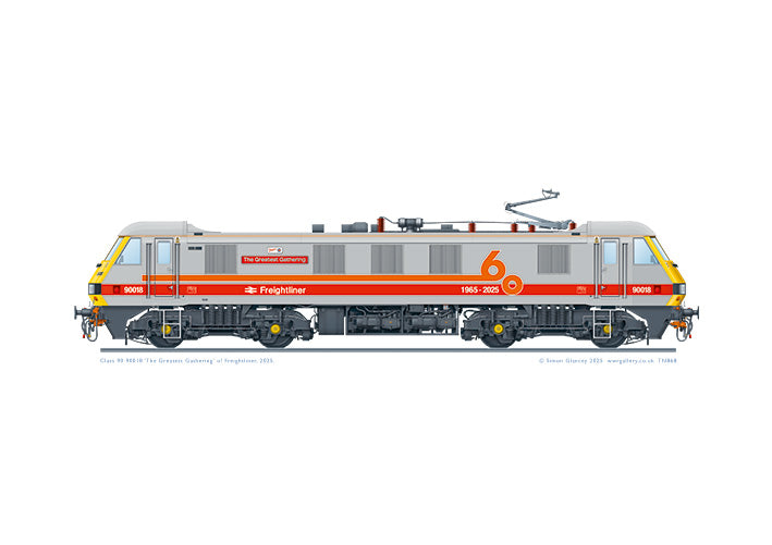 A super-detailed A3 print of Freightliner Class 90 locomotive 90021, which was named 'The Greatest Gathering' at Derby in August 2025 as part of the railway exhibition to mark 200 years since the hauling of the world's first passenger train by Locomotion No.1. The special grey livery was applied to 90021 to mark 60 years of Freightliner operations, and is inspired by the livery applied to the original Freightliner containers when they entered service in 1965.