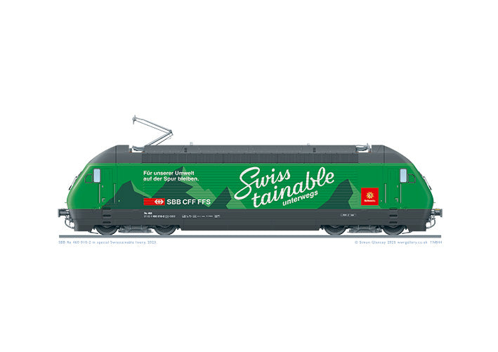 A highly detailed A3 size art print of SBB locomotive Re 460 010-2 in the stunning ‘Swisstainable’ livery, promoting sustainable travel in Switzerland.